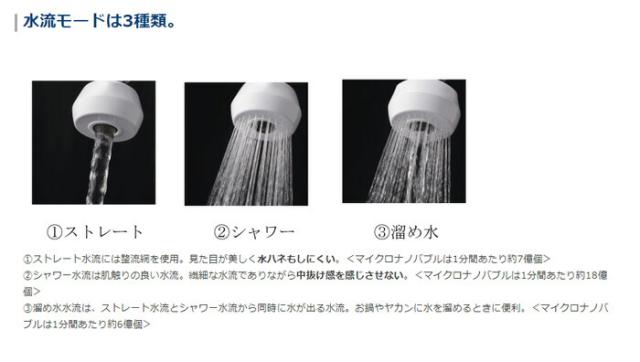 3、溜め水水流は、ストレート水流とシャワー水流から同時に水が出る水流。お鍋やヤカンに水を溜めるときに便利。