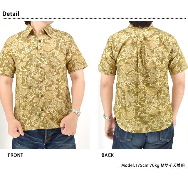 味わい深い物作りをされている衣櫻さんから、半袖レギュラーカラーシャツ「蓮鯉」(SA-1693)のご紹介です。 抜染で蓮鯉を総柄調にデザインした、インパクト抜群の半袖シャツが登場しました! ボディーには、さらりとした質感の薄手なシーチング生地を採用。 一枚で着るのはもちろん、汗ばむ季節にTシャツやタンクトップの上からさらりと前開きで羽織るも良し。 ※この製品は一枚ずつすべて色柄出しが異なります。 | |||||||||||||||||||||||||