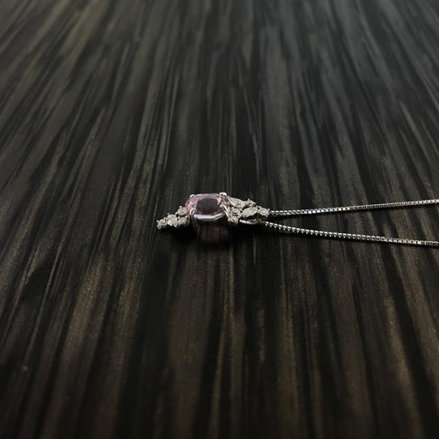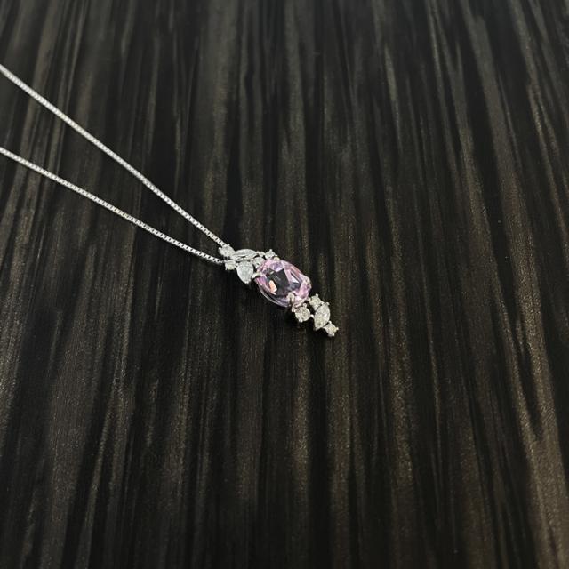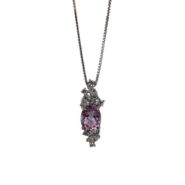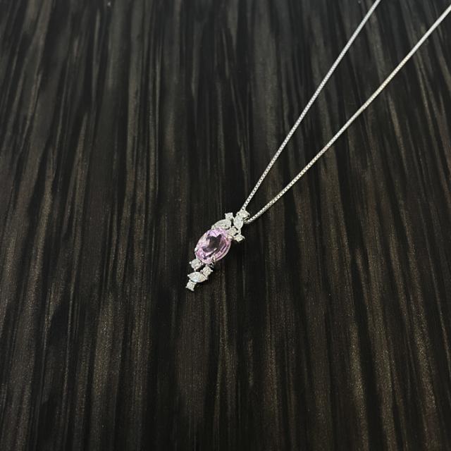 華やかなピンクに輝くクンツァイト。様々な形のダイヤモンドが加わることで上品なペンダントに。