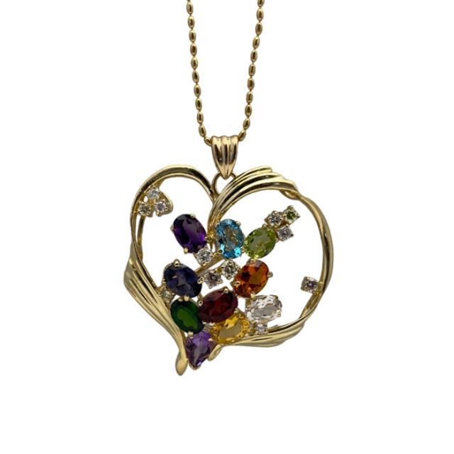 ダイヤモンド、アメジスト、アイオライト、グリーンガーネット、シトリン、ホワイトトパーズ、ブルートルマリン、マルチの天然石を使ったボリュームのあるペンダントです。