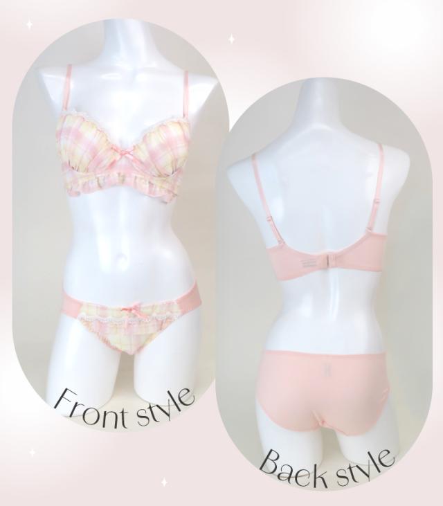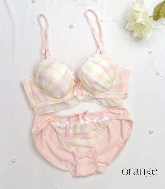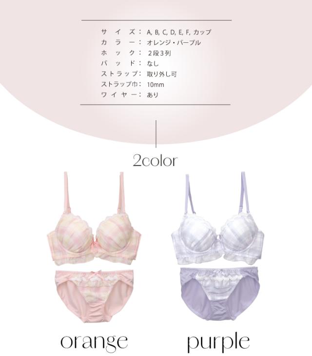 ナチュラルで可愛らしいチェック柄が魅力のブラジャー&ショーツセット。レースのディテールと小さなリボンが女性らしさを引き立てます。バストをやさしく包み込むカップと、ソフトなフィット感で快適な着心地を実現。柔らかく甘い印象のオレンジと爽やかなパープルの2色展開。デイリー使いにぴったりな、カジュアルでキュートなデザインです。毎日をちょっぴり特別にしてくれる一着を、ぜひお試しください。