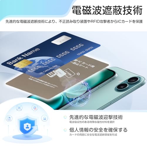 電磁波遮蔽技術 先進的な電磁波迎撃技術を採用し、電波吸収性のある特殊な磁性材料を選択し、不正な読み取り装置やRFID攻撃者からの電磁波を効果的に遮断し、ICカードを情報漏洩のリスクから保護する。カードの周囲に安全な電波遮断領域を形成し、個人情報の安全を確保する。