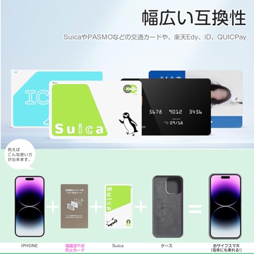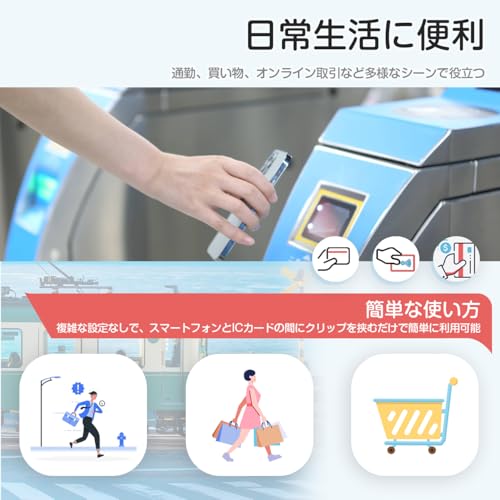 幅広い互換性 交通カード(Suica、PASMOなど)、電子マネー(楽天Edy、iD、QUICPayなど)、さまざまなスマートフォンなど、さまざまなタイプのICカードに対応しており、多様な利用ニーズに対応しています。日常の通勤にも、買い物の支払いにも、オンライン取引にも、気軽に対応できます。