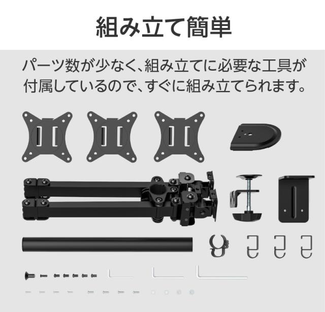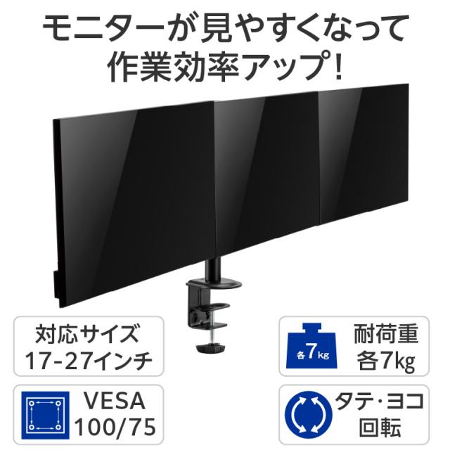 モニターアーム 3画面 17-27インチ 各〜7kg 水平可動方式 前後移動 4軸 クランプ グロメット ディスプレイ GH-AMDN3H-BK グリーンハウス