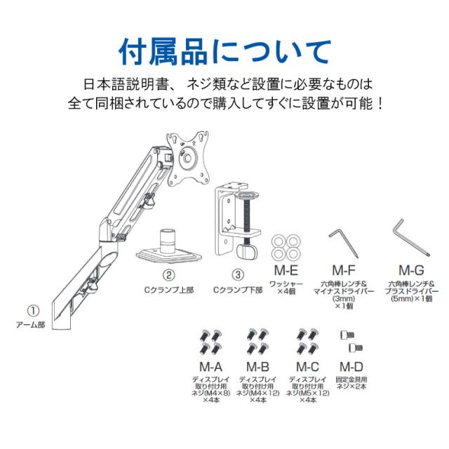 ディスプレイ取り付け用ネジ(M4×8、M4×12、M5×12)×各4個、六角棒レンチ&マイナスドライバー(3mm)、六角棒レンチ&プラスドライバー(5mm) 、ワッシャー×4個、取扱説明書/保証書