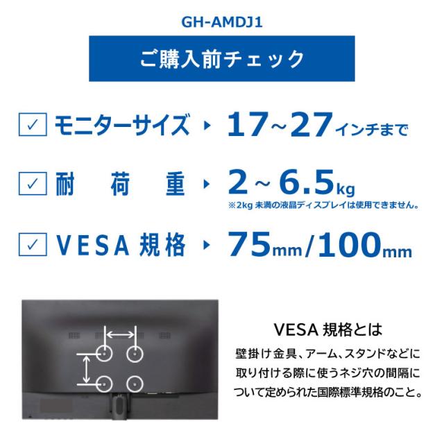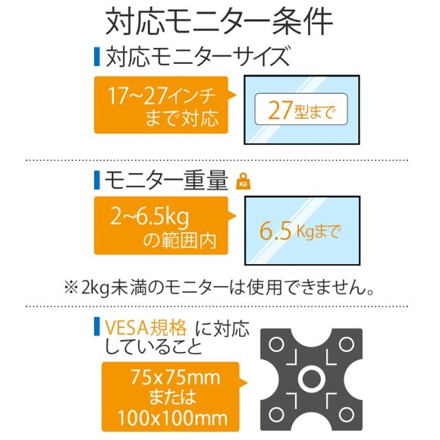 ●耐荷重:2kg〜6.5kg ※2kg未満の液晶ディスプレイは使用できません。