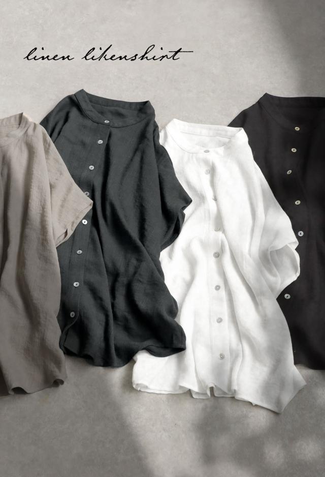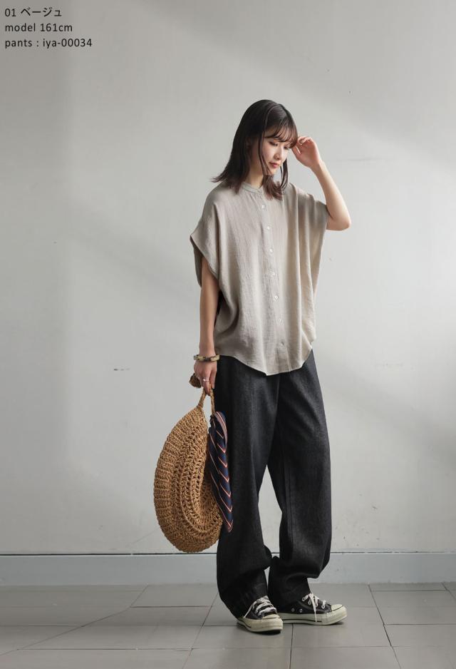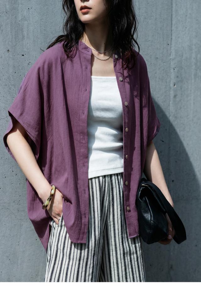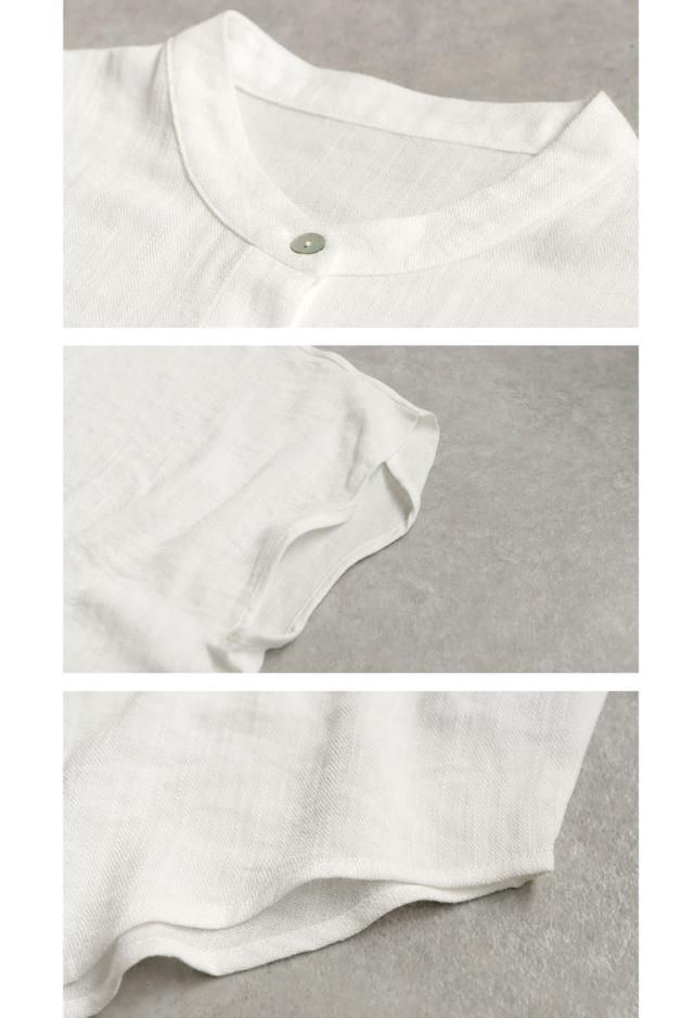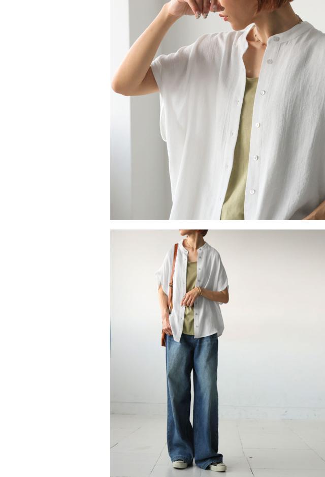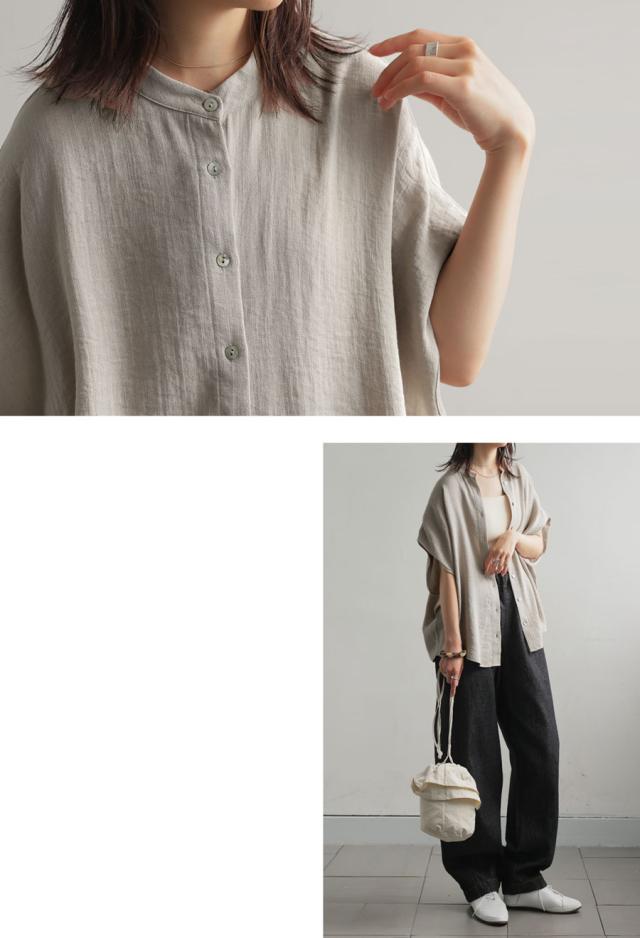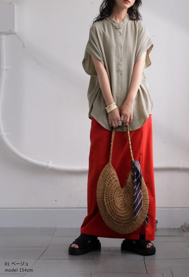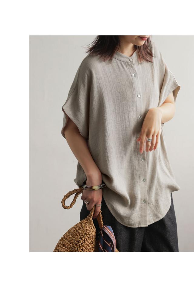 リネンライク シャツ レディース 半袖 バンドカラー 送料無料・新色登場 再入荷 (80)メール便可