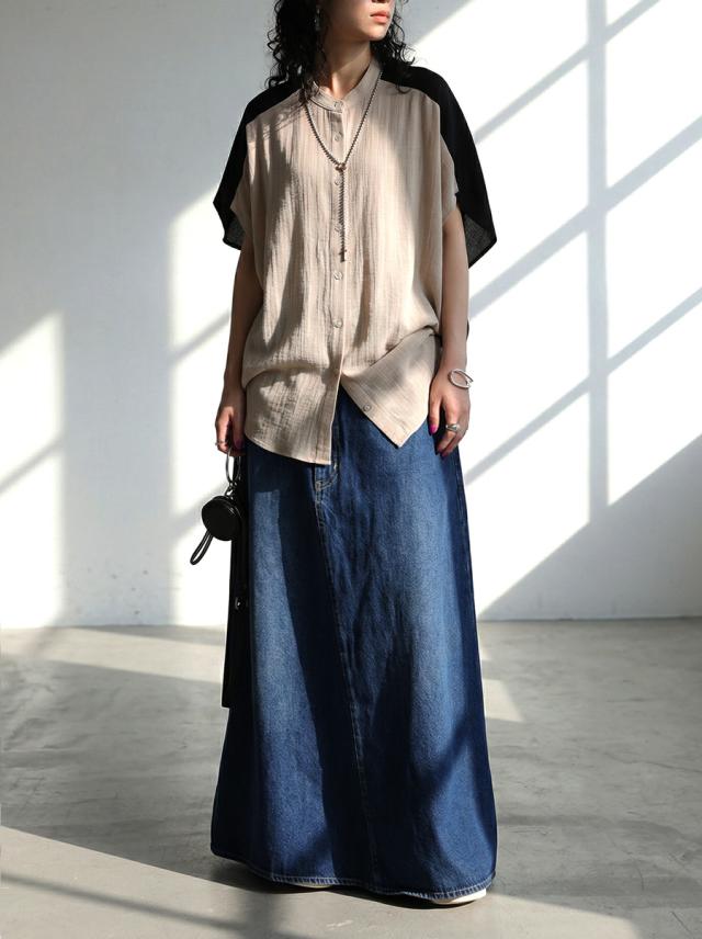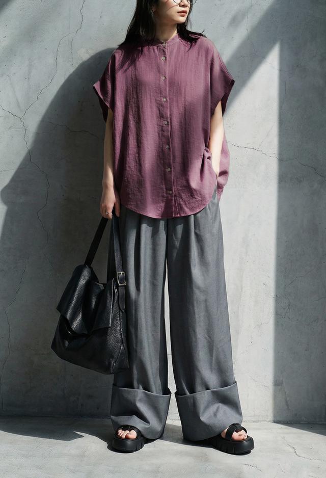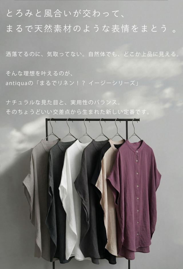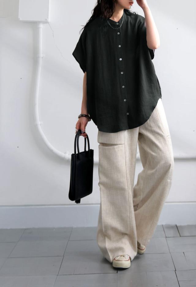 ネックラインはすっきりとしたバンドカラーで、大人らしい上品さと抜け感を演出します。