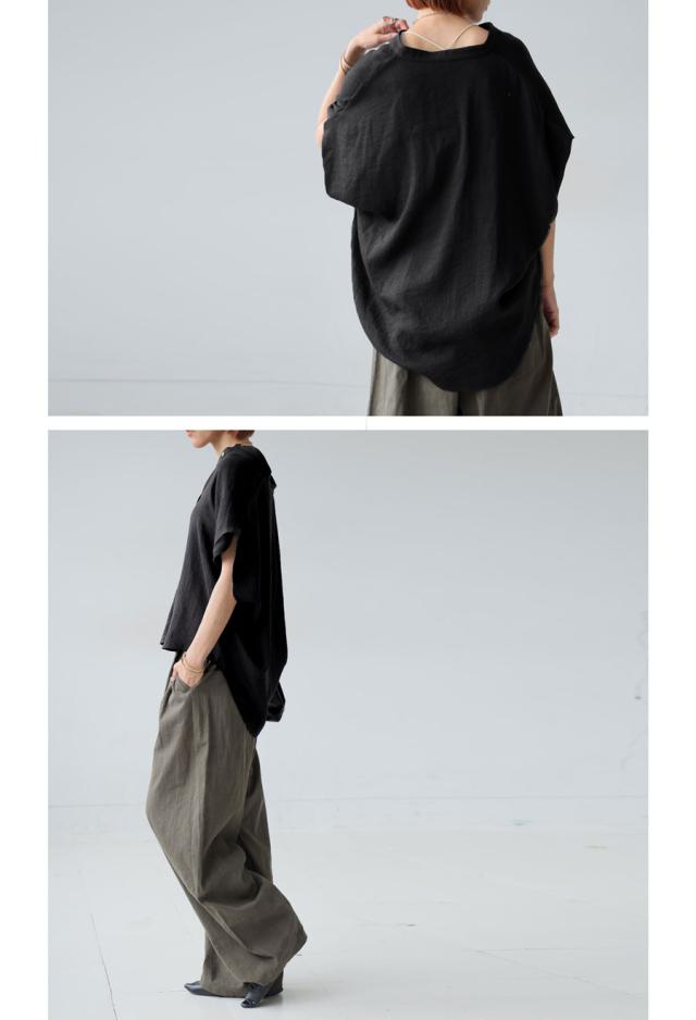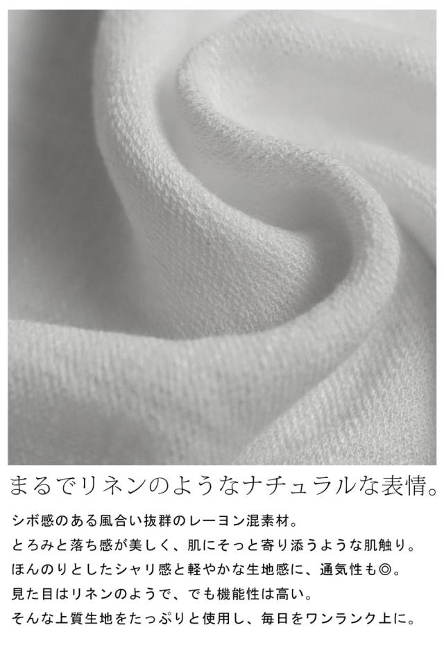 袖丈はゆったりとしたドルマンスリーブで、半袖仕様ながら腕まわりを自然に包み込み体型カバーにも優れています。