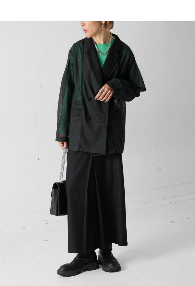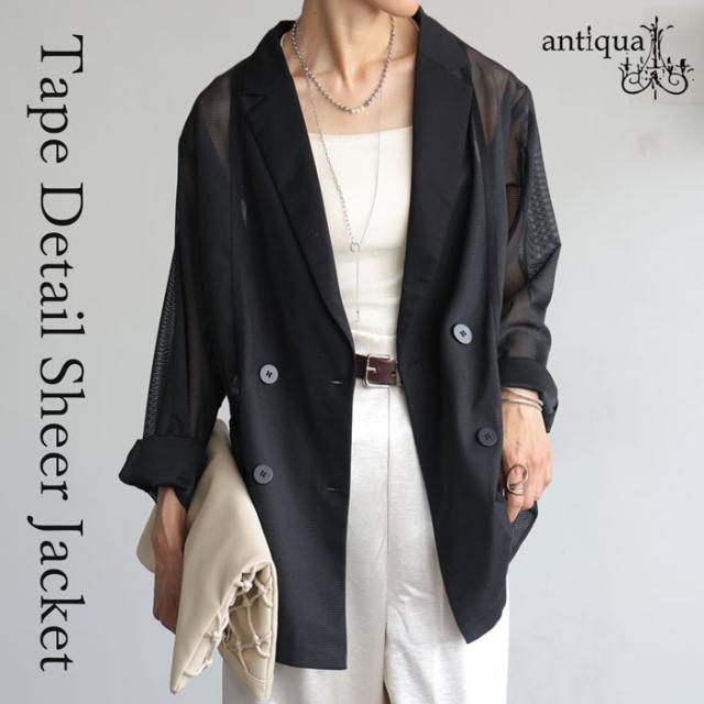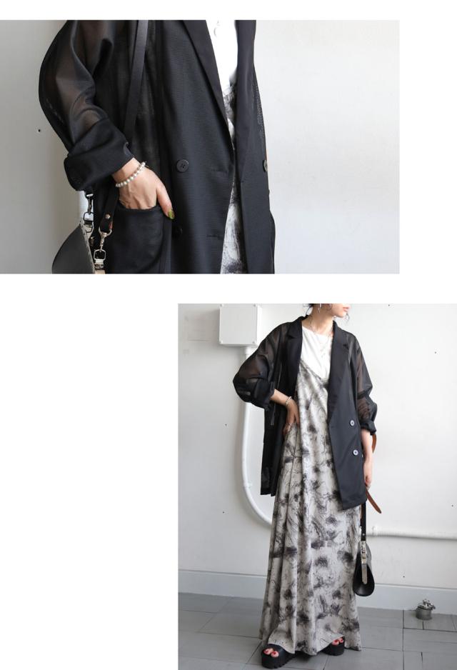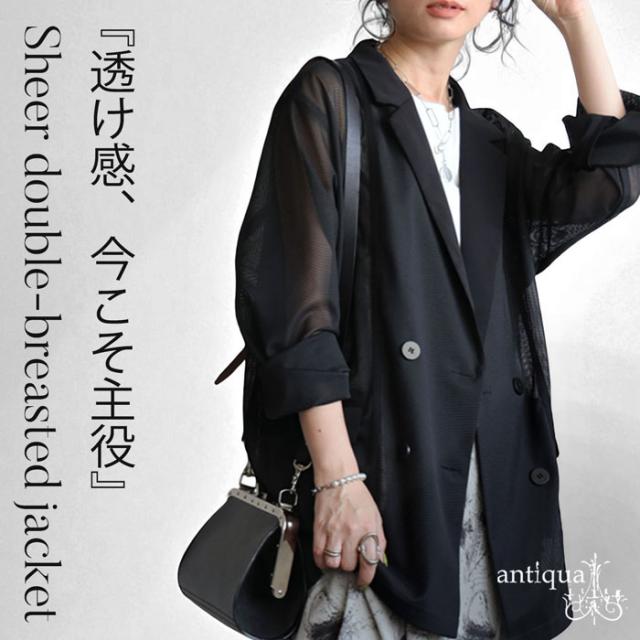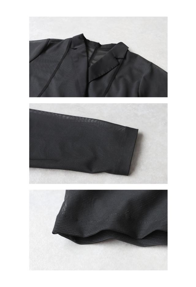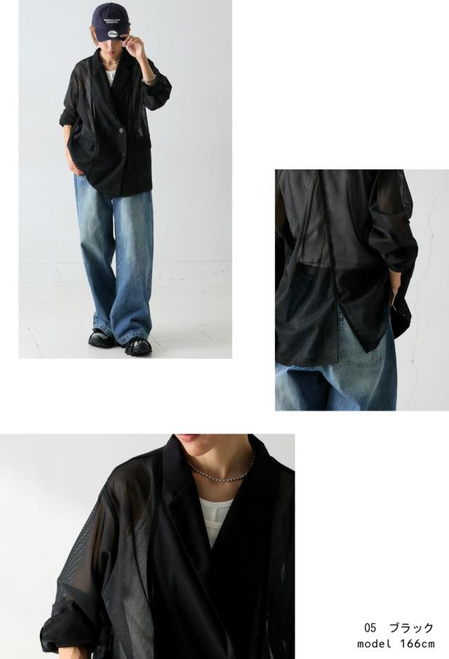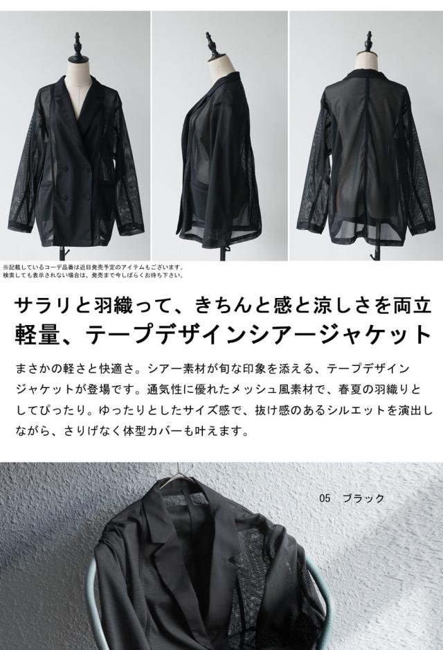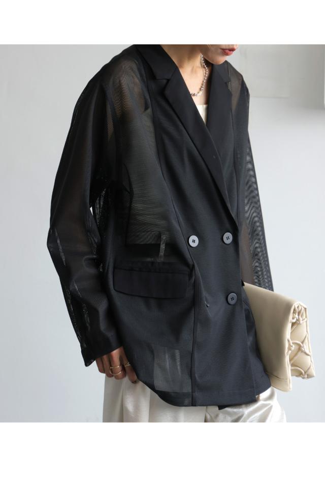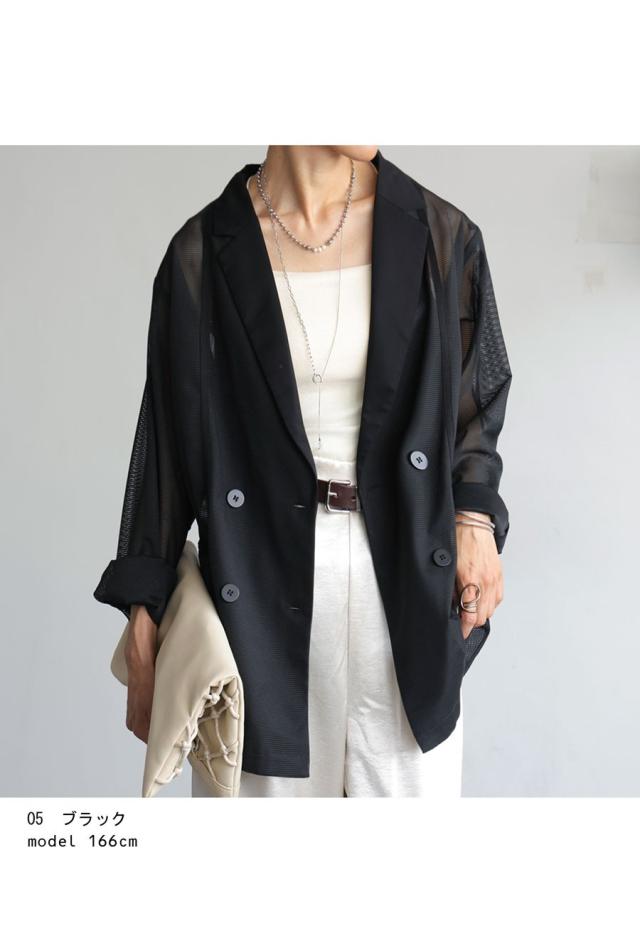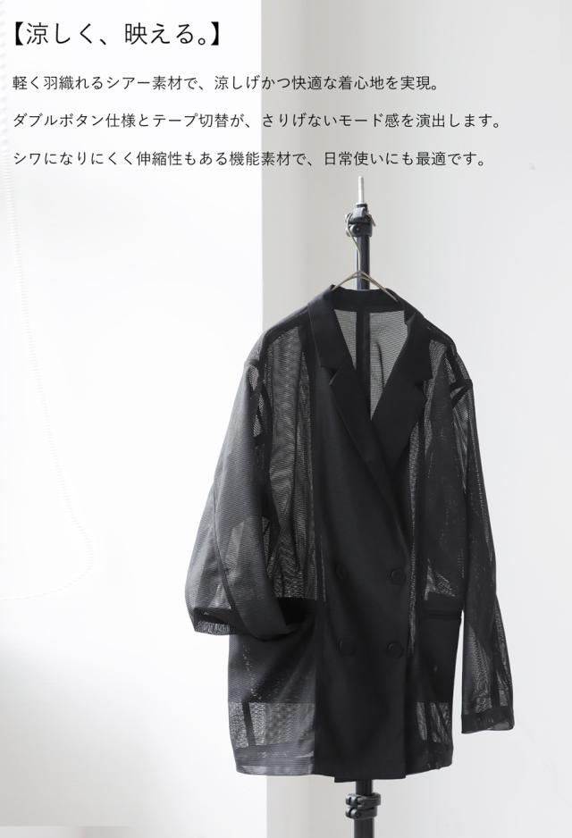 pk-01352 ジャケット 羽織り ライトアウター メッシュ ダブルボタン モード 通勤 涼感 透け ストレッチ しわになりにくい 体型カバー 無地 テープデザイン テーラードジャケット