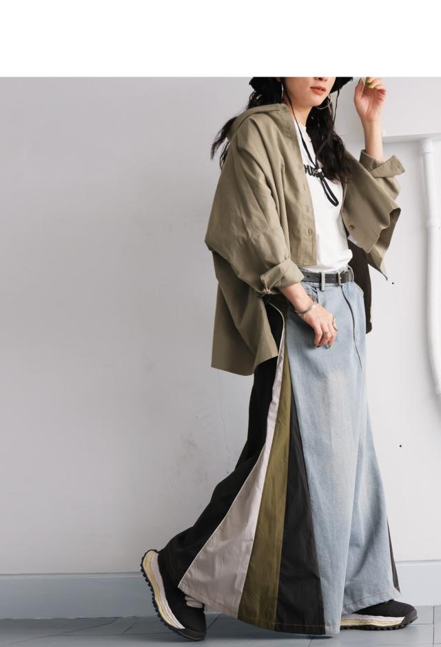 カラーは2色展開。カーキ×デニムは、ミリタリーテイストをさりげなく取り入れたクールな印象に。深みのあるカーキ(オリーブ・モスグリーン・Khaki)とブルーデニムの対比が、洗練されたカジュアルスタイルを演出します。