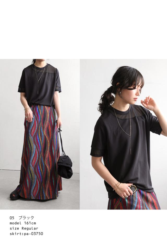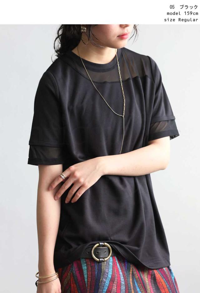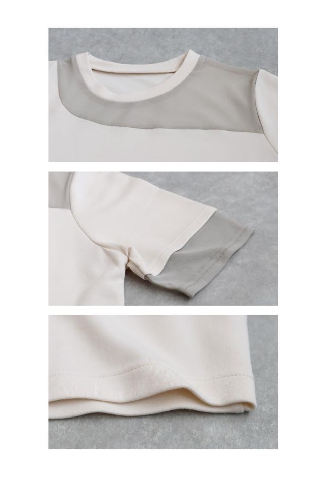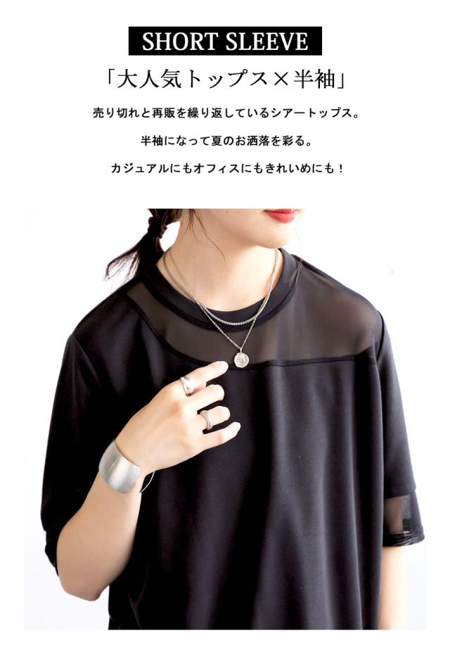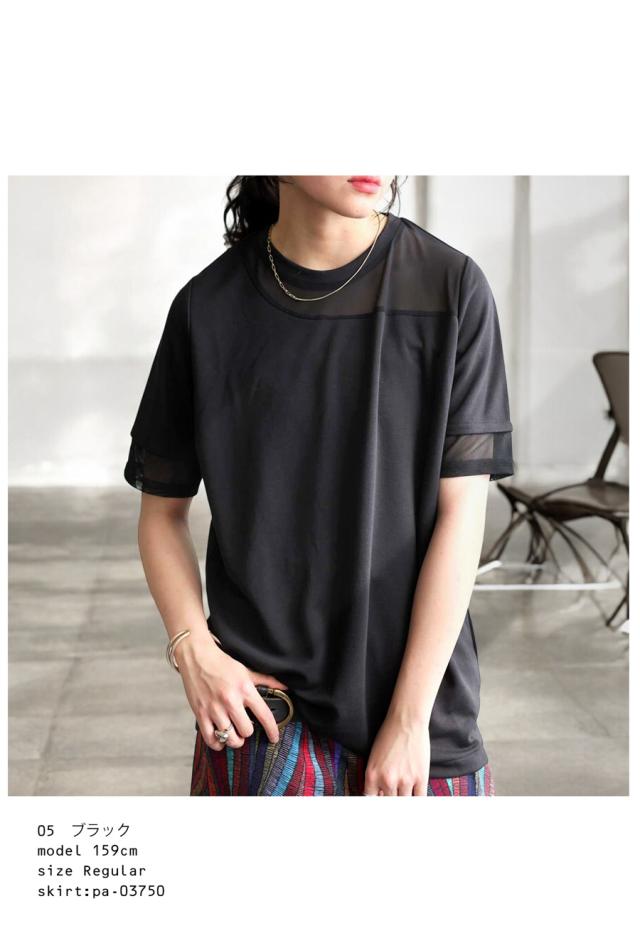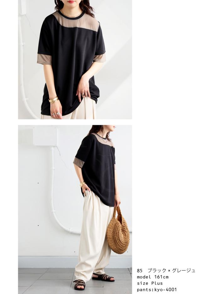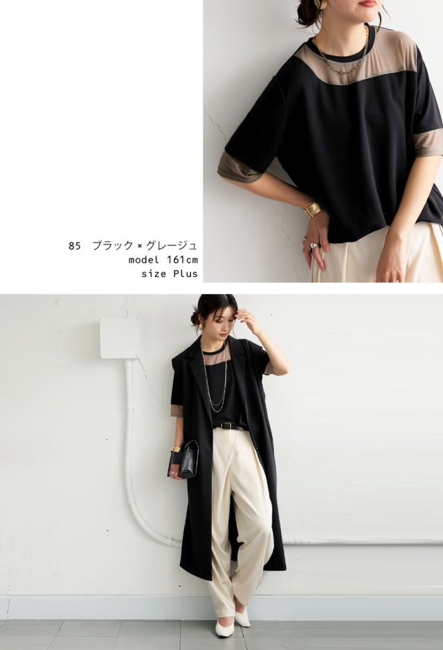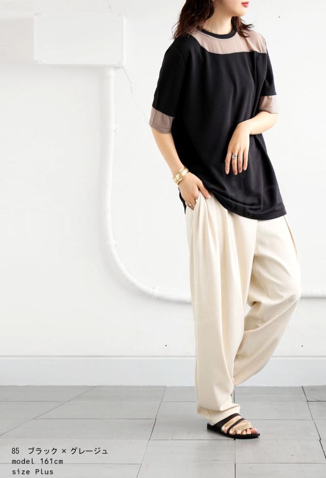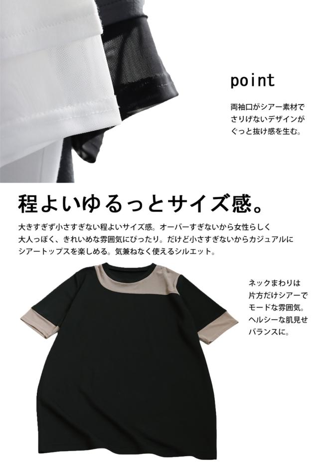 pn-00576 トップス 半袖 シアー 切替 異素材 ドッキング 透け 涼しい クルーネック ゆったり 大人 体型カバー 黒 白 グレー ベージュ カジュアル きれいめ シンプル モード