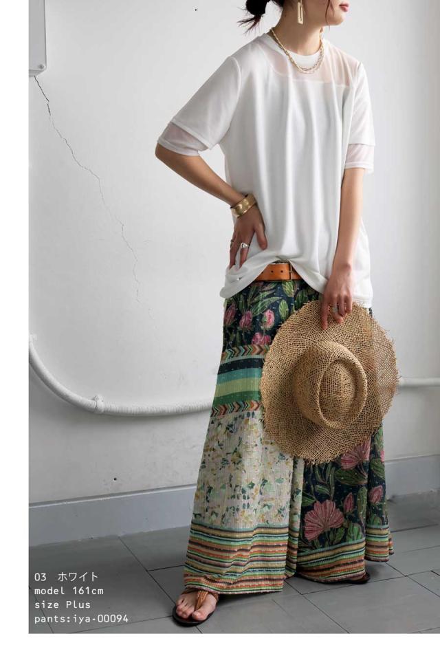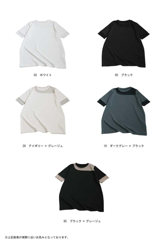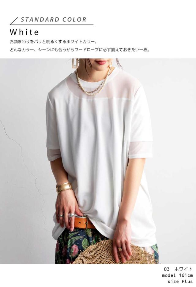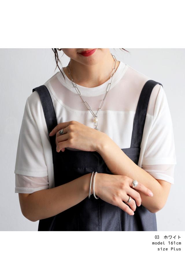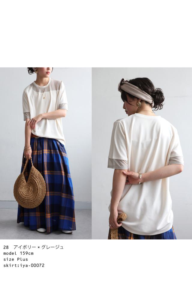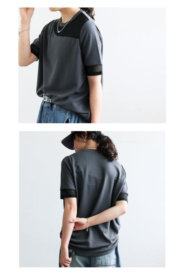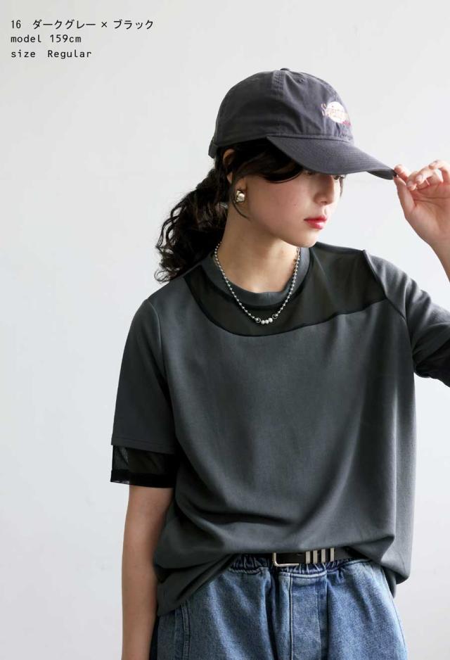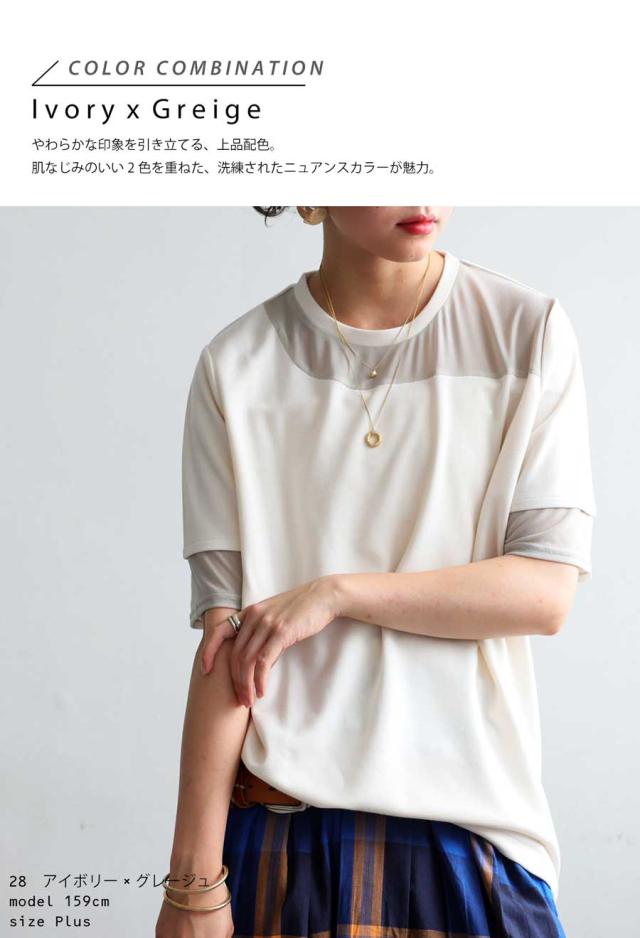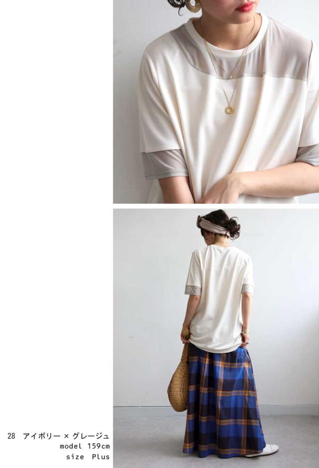 pn-00576 トップス 半袖 シアー 切替 異素材 ドッキング 透け 涼しい クルーネック ゆったり 大人 体型カバー 黒 白 グレー ベージュ カジュアル きれいめ シンプル モード