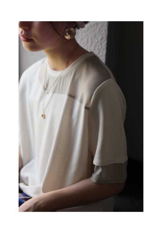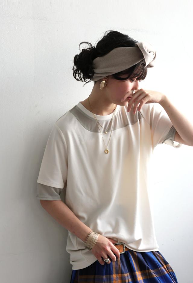 柔らかな生地感とシアー素材の異素材ドッキングが、ナチュラルでモードな雰囲気を引き立てます。