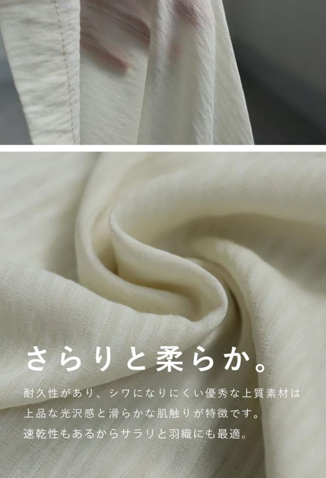 素材はシワになりにくく、さらりとした肌ざわりで軽やか。速乾性にも優れ、季節の変わり目にも使いやすい一枚です。