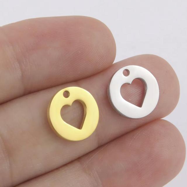 小さいフラットな丸型にハートをくり抜いたステンレス製のチャームパーツ。