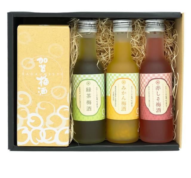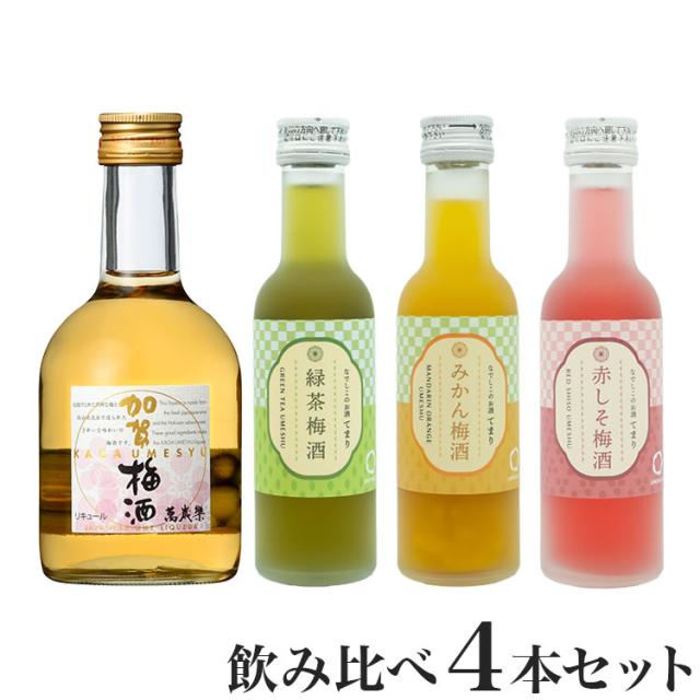 原材料(アレルギー表記含む):萬歳楽 加賀梅酒300ml:紅映、氷砂糖、醸造アルコール、なでしこのお酒「てまり」赤しそ梅 180ml: 梅・砂糖・醸造アルコール・しその葉・野菜色素・香料、なでしこのお酒「てまり」緑茶梅酒 180ml:梅・砂糖・醸造アルコール・緑茶・緑茶エキス・香料・くちなし色素・紅花色素 、なでしこのお酒「てまり」みかん梅 180ml:梅・砂糖・醸造アルコール・温州みかん