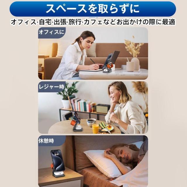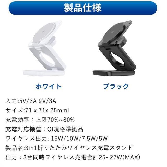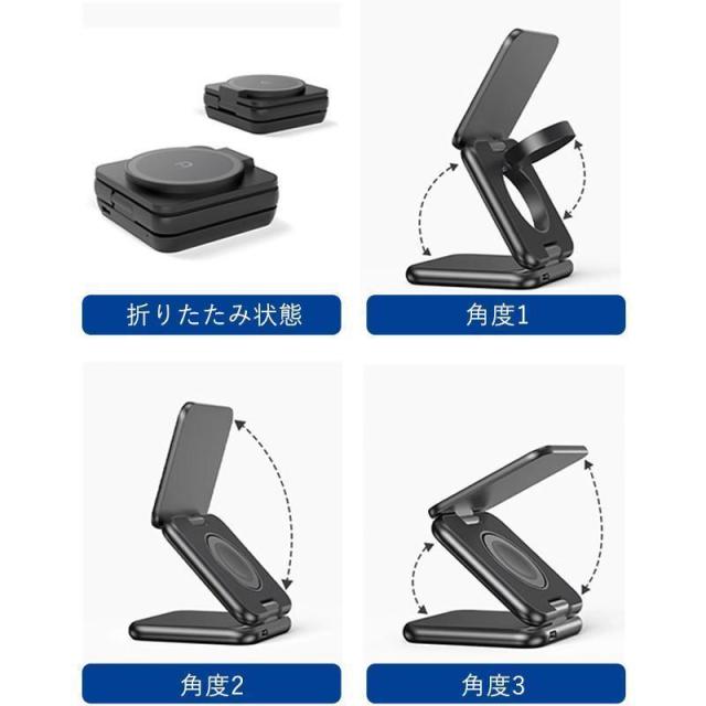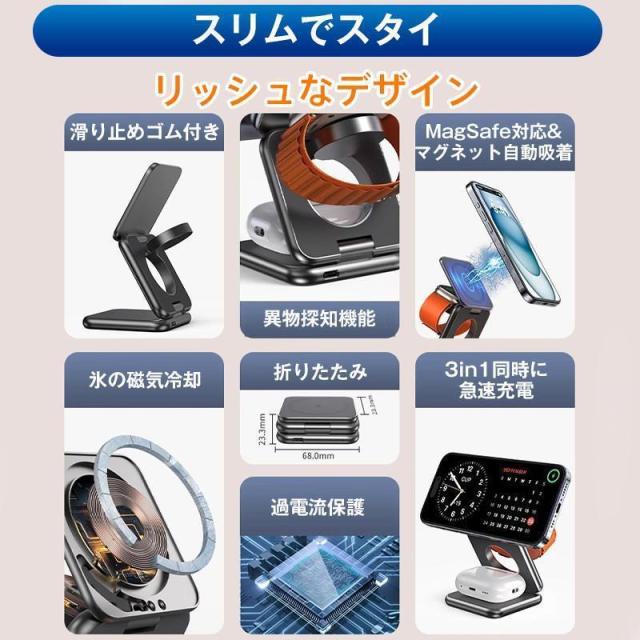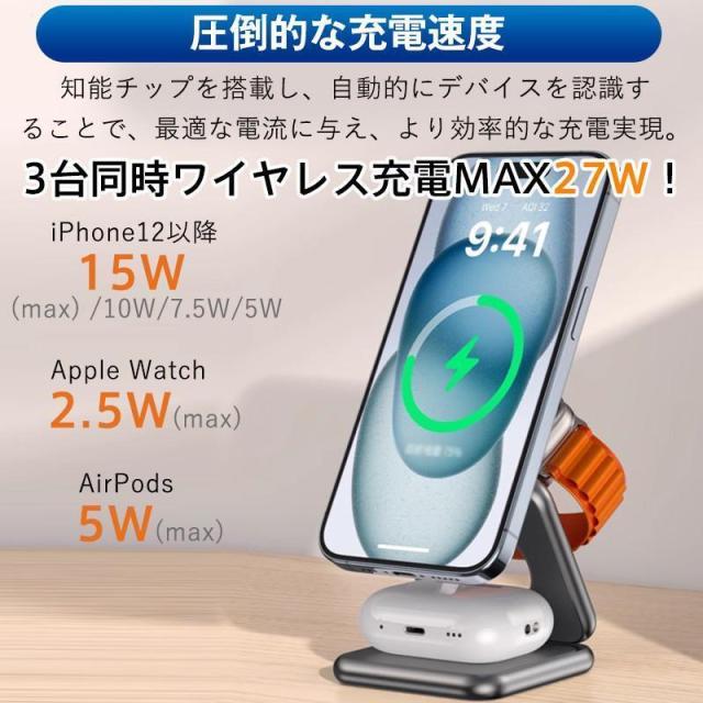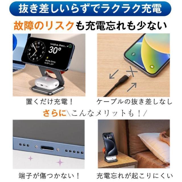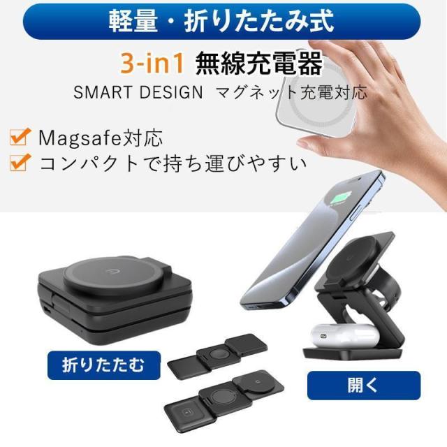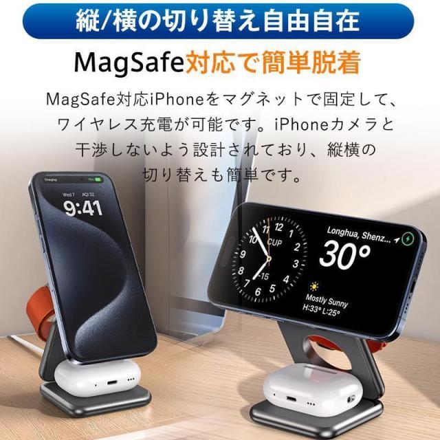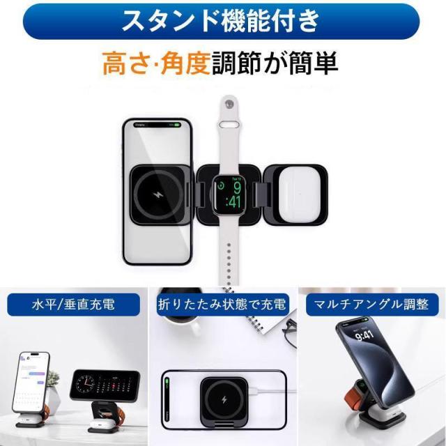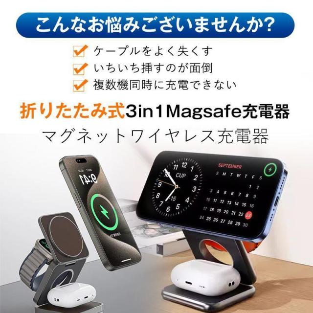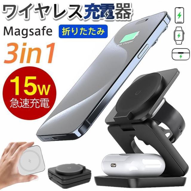 ワイヤレス充電器 3in1 3台同時充電 マグネット MagSafe 充電器 折りたたみ 15W 急速充電 置くだけ充電 コンセント 軽量 薄型 AppleWatch充電器 Airpods対応