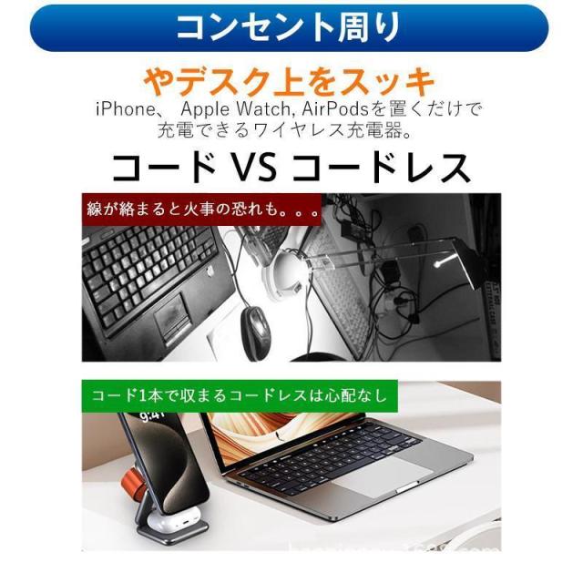 3in1 ワイヤレス充電器 充電器 iPhone充電器 軽量 ワイヤレス充電スタンド 薄型 急速充電 iphone スマホ充電器 iPhone Android Apple Watch Airpods対応 AirPods 2 3 コンパクト 軽量 折り畳み式 コンセント 持ち運び iPhone15 15pro 15promax 14 iPhone14Pro iPhone14ProMax iPhone13 13pro 13proMAX iPhone12 12pro 12proMAX iPhone11 11pro 11pro 11proMAX iPhone 8 アップルウォッチ充電器 Apple Watch Series1/2/3/4/5/6/7/8/9