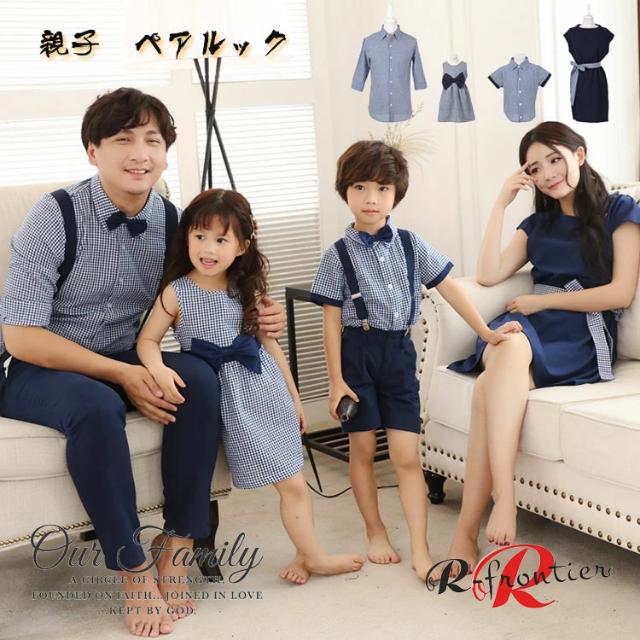 リンクコーデ 親子 セット 夏 親子ペア ワンピース シャツ 親子コーデ 紺色 チェック柄 家族お揃い 親子コーデ サロペットパンツ 夏 子供服 パパ ママ 男の子 女の子 娘 息子 家族活動 旅行 生産お祝い 七五三 結婚式 フォトウェア カップルペア 恋人 ギフト 夏休み 海見