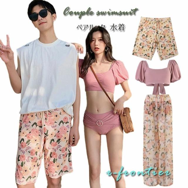 ペア水着 カップルお揃い パレオ付き セパレート 体型カバー 露出控えめ ペア水着 半袖トップス インナーパンツ 3点セット レディース メンズ 男性用 ビーチパンツ ハーフパンツ セクシー 盛れる ラッシュガード 夫婦お揃い 温泉 ハネムーン 蜜月 海外旅行 新婚旅行 夏