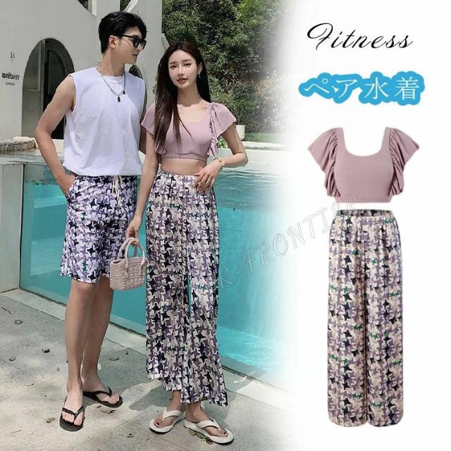 カップル ペア水着 日よけ レディース 体型カバー セパレート 3点セット 可愛い ワイドパンツ ビキニ 男性 ビーチパンツ カップル ペアルック 大きいサイズ 夏 タンキニ パンツ 花柄 パッド付き メンズ サーフパンツ セクシー 男女 温泉 ハネムーン 旅行 韓国