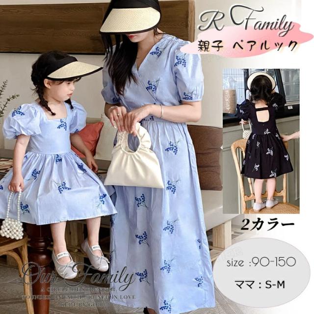 親子ペア ワンピース 夏 刺繍柄 半袖 ブルー ブラック ワンピース リンクコーデ 親子 セット 小さい柄 母娘 親子ペア 韓国風 ペアルック 女の子 ママと娘 韓国 子供服 ママと娘 きれいめ 夏 100 140 着痩せ 大きいサイズ 可愛い 誕生日 母の日 プレゼント 2色