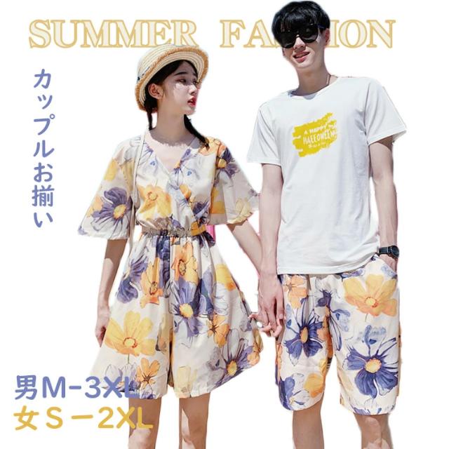 ペアルック カップル ワンピース ビーチウエア カップル ペアtシャツ 花柄 シャツ アロハ パンツセット 夏 海遊び セットアップ ペアお揃い 半袖 tシャツ トップス 韓国風 夏 男 上下セット 夫婦お揃い シャツ ハワイリゾート 沖縄 海旅行 記念日 カップルペア 夏休み