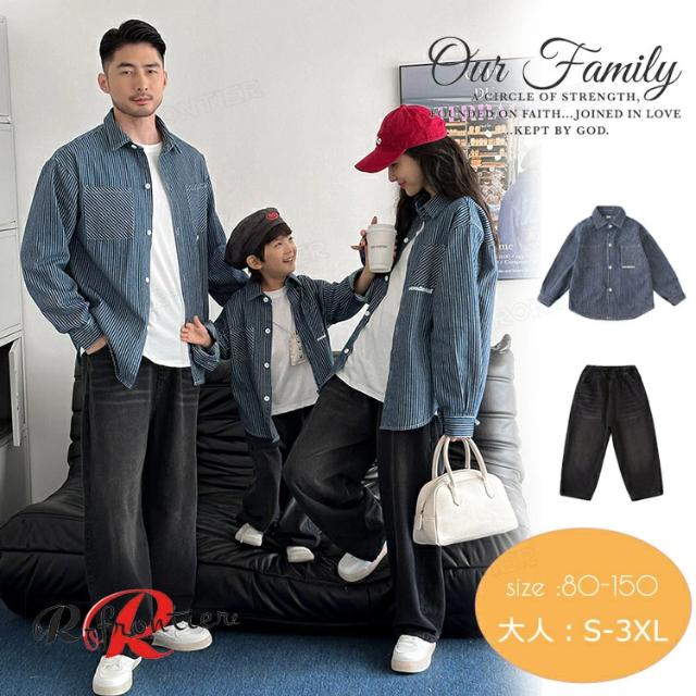 親子 ペアルック デニムセット 長袖 トップス ロングパンツ リンクコーデ 親子 セット 縞柄 シャツ デニムパンツ ゆったり 親子 おそろい 秋物 おしゃれ 韓国風 子供服 女の子 男の子 パパ ママ 家族お揃い カップル 夫婦 恋人 誕生日 父の日 プレゼント 80-150