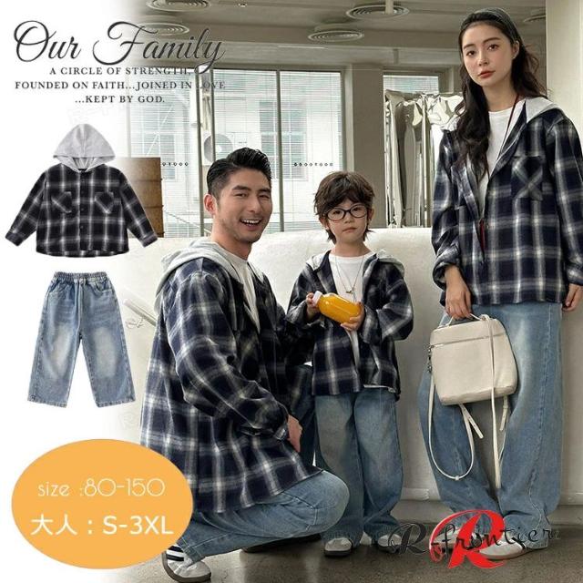 親子ペアルック 長袖 トップス デニムパンツ リンクコーデ 親子 セット チェック柄 シャツ フード付き パンツ ゆったり 親子 おそろい 秋物 おしゃれ 韓国風 子供服 女の子 男の子 パパ ママ 家族お揃い カップル 夫婦 恋人 誕生日 記念撮影 父の日 プレゼント 80-150