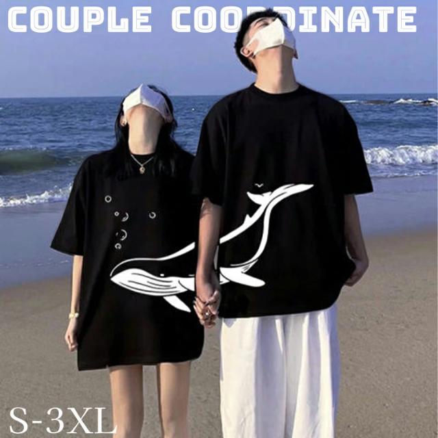 【2枚セット】カップル ペアtシャツ 鯨 クジラ 可愛い カップルお揃い tシャツ カップルお揃い ペア柄 黒 白 大きいサイズ オーバーサイズ ゆるシャツ おしゃれ t シャツ お揃い服 コーデ 3XL メンズ 半袖 リンクコーデ オシャレ ゆったり 夏 ギフト 記念日