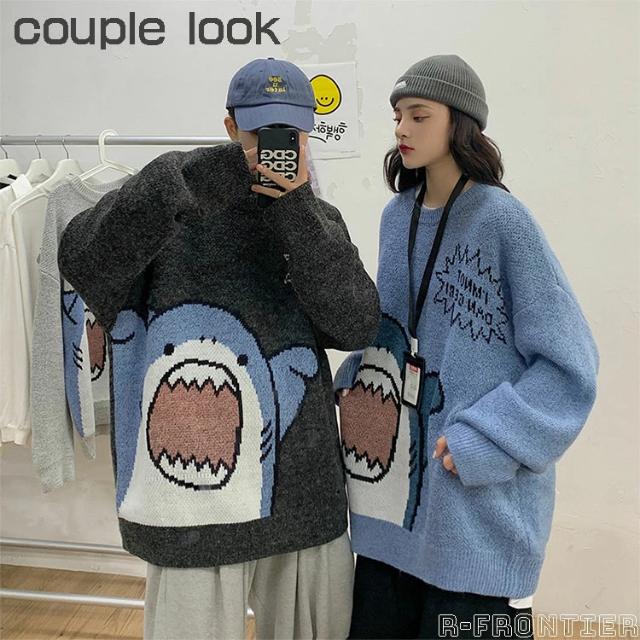 カップル ペア セーター ニット サメ ルームウェア 秋冬 可愛い 鮫 大きいサイズ ゆったり カップルお揃い ネイビー グレー カップル おそろい 黒 大きいサイズ 春 お揃い服 ペア柄 オーバーサイズ おしゃれ 暖かい メンズ 長袖 記念日 サメルームウェア