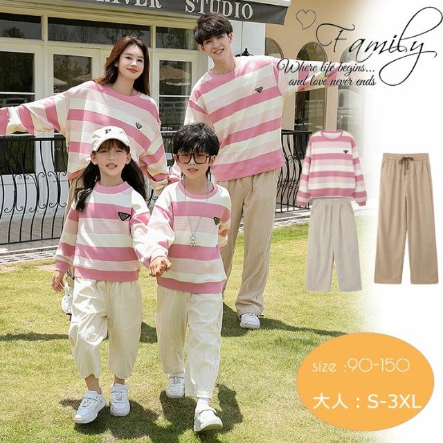 親子ペア 長袖 トレーナー ピンク 縞柄 パーカー リンクコーデ 親子 セット 春 tシャツ ロングパンツ 親子 おそろい パパ スウェット おしゃれ ins風 韓国風 子供服 女の子 男の子 オシャレ カップル 夫婦 恋人誕生日 父の日 母の日プレゼント 90-150