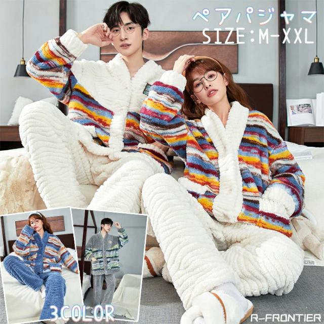 カップル ペア パジャマ モコモコパジャマ お揃い 冬 ルームウェア レディース 虹色 上下セット 男女お揃い メンズ 大きいサイズ 裏起毛 厚手 部屋着 フリース 大人用 前開き 羽織り ペアルック おしゃれ 寝間着 出かける 可愛い 寝巻き パジャマ セット カラフル プレゼント