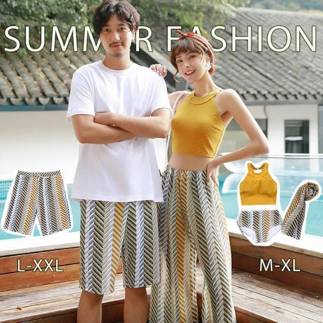 水着 カップル みずぎ ミズギ 男女 温泉 お揃い パッド付き 日よけ メンズ水着 男性用 ビーチパンツ サーフパンツ ハネムーン 海外旅行 夏 蜜月 新婚旅行 オフショルダー 3点セット セットアップ セクシー フリル カバーアップ バスト ライン柄 盛れる 露出控えめ 送料無料
