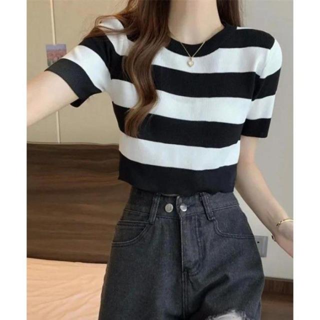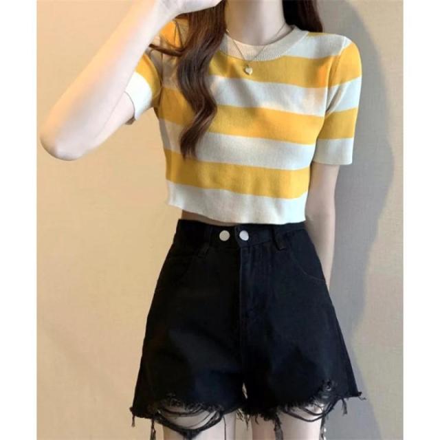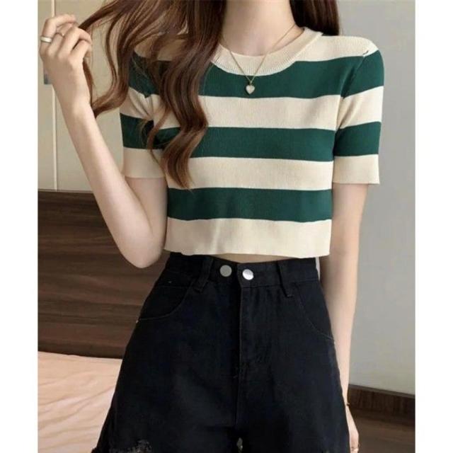 ショート丈ニットトップス へそ出し レディーストップス クルーネック ニットTシャツクロップド 配色ライン カジュアル