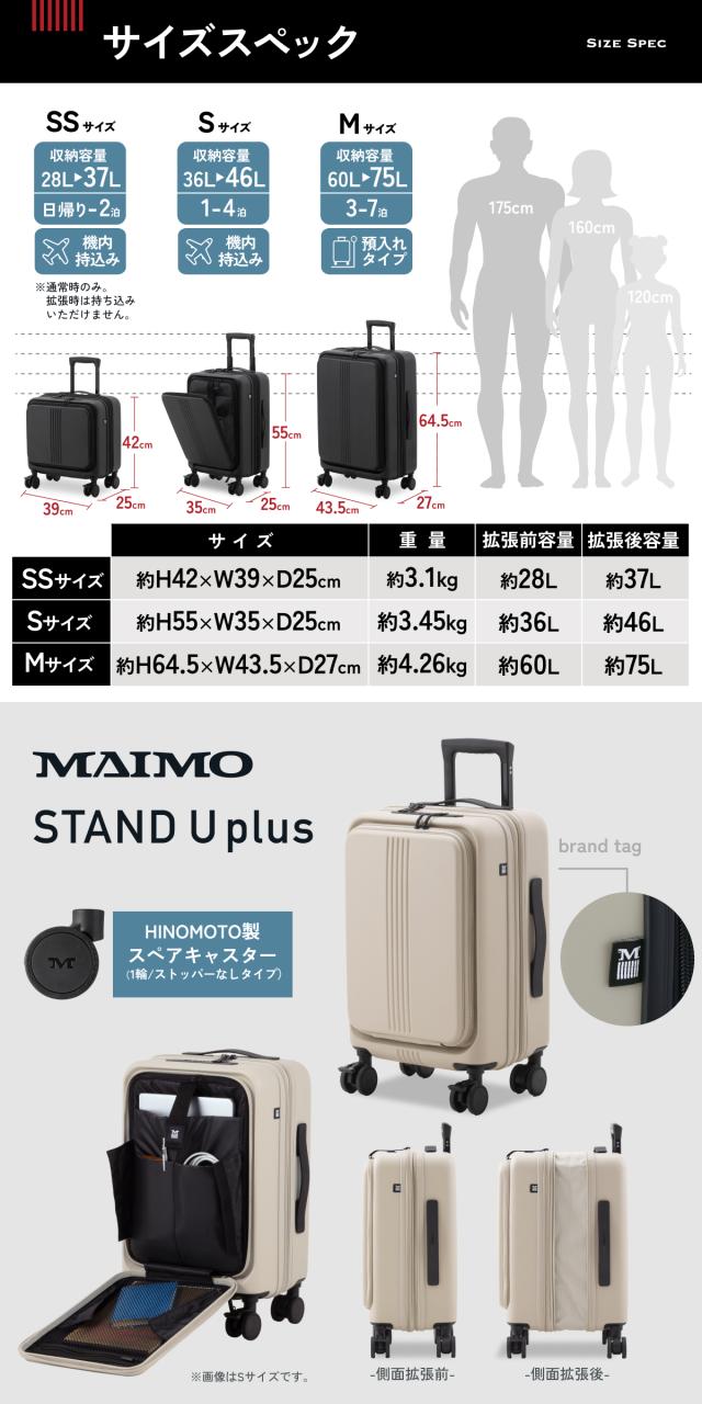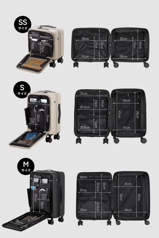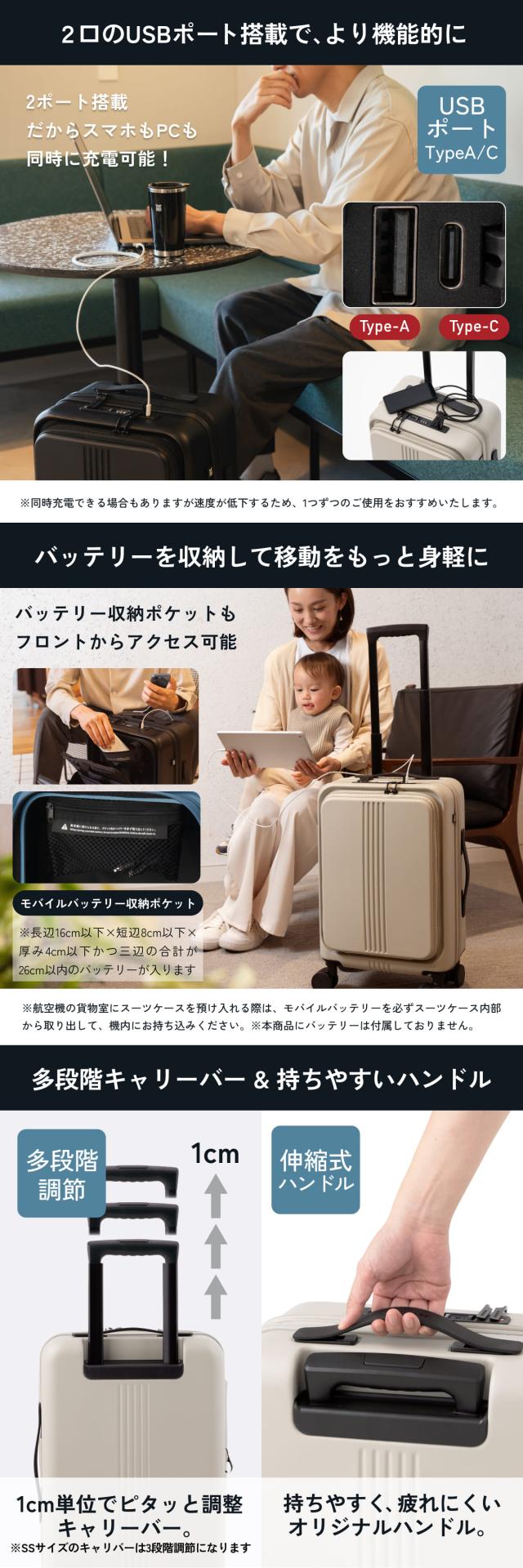 【業界最高クラスの拡張力】8cmの拡張機能で、最大容量約75L。お土産をたくさん買っても安心。拡張部のコーナーはナイロンベルトで補強され、拡張しても強度の心配不要。【出し入れ簡単】フロントオープン機能で、荷物をスムーズに取り出せます。メイン収納へのアクセスも可能でとっても便利。ポリカーボネート100%で軽さと耐久性を両立。【交換可能なストッパー付き静音キャスター】HINOMOTO製静音キャスターを採用。ストッパー機能付きで、立ったままブレーキ可能。丸洗い可能で交換もできるため、長く使えます。スペアキャスター付きで安心。 【USBポート付きTSAロック・多段階キャリーバー】暗証番号タイプの最新セキュリティーで、鍵を失くしません。USBポート付きで移動しながらの充電も可能。キャリーバーはシーンや身長に合わせて調整可能。