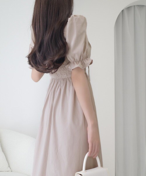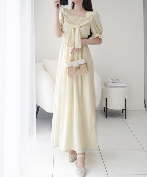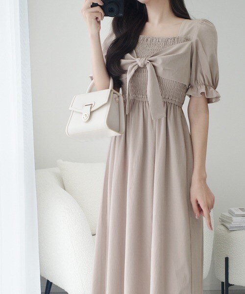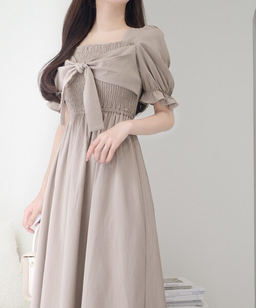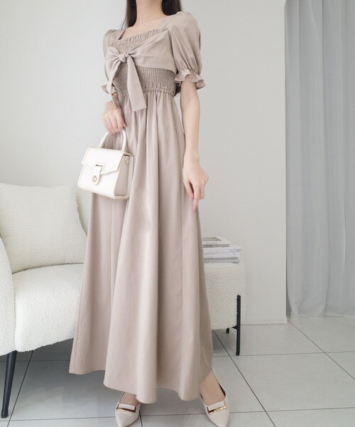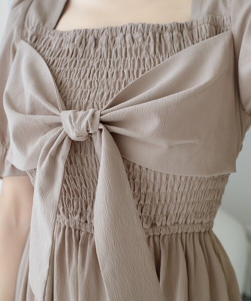 【mily bilet】大人エレガントを演出する。ビッグリボン使いシャーリングワンピース(ロング丈)