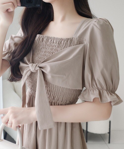 シャーリング加工とリボンの組み合わせが華やかで印象的なスタイルに。