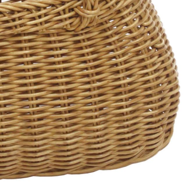 天然素材で編まれたような自然な温かみを感じるかごバッグです。ほのかな膨らみが可愛らしいオーバル型です。ひざの上に収まる持ちやすいサイズ感でありながら、お出かけの必需品もしっかり入ります。