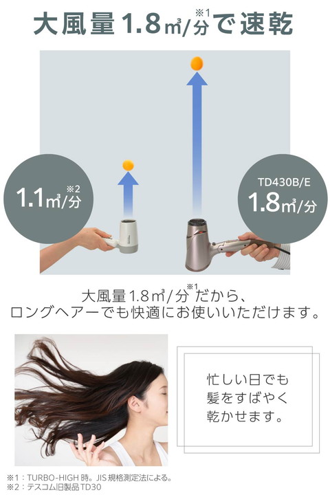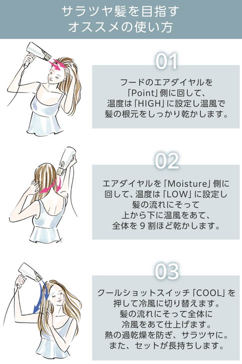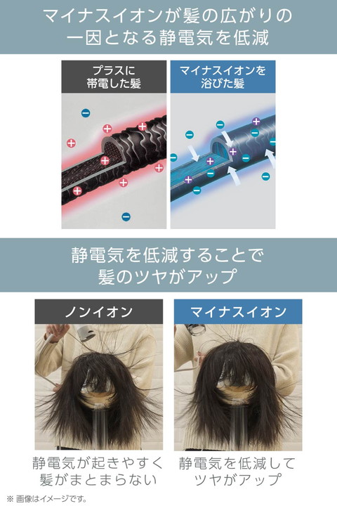 風も温度も好みでアレンジ。乾かし方が調整できる多機能ドライヤー![]() ■【モイスチャー】マイナスイオンと風を髪全体へ。広範囲に届けます。【ポイント】マイナスイオンと風を集中させる。髪の根元もしっかり乾かせます。※イメージ図 ■大風量ですばやくしっかり乾かします。 ■抗菌剤を配合しているので、清潔に使えます。 ■TURBO‐DRY‐SET 速乾からセットまで簡単に切替えできる、選べる3段階風量。 ■【HIGH】温かい風で素早くドライ。寒い季節にも。【LOW】低めの温度でやさしくドライ。暑い季節にも。 ■ホコリの堆積が分かりやすい黒い吸込口フィルター採用 ■独自の放出方式で、熱による減少に負けず髪全体にマイナスイオンを行き渡らせます。髪の広がりの一因である静電気を低減し、髪のツヤもアップ!※イメージ図 ■電源コードがねじれにくいので、使いやすく保管もきれいにできます。 ■レバーを押すだけでコンセントから簡単に抜けます。 ![]() ■サイズ:高さ / 298mm・幅 / 166mm・奥行き / 95mm(本体のみ)、高さ / 298mm・幅 / 215mm・奥行き / 95mm(2Wayモイスチャーフード付き) ■質量:500g(本体のみ)、540g(2Wayモイスチャーフード付き) ■消費電力:1200W ■付属品:2Wayモイスチャーフード ■電源:AC100V 50/60Hz ■スイッチ:メインスイッチ「TURBO-DRY-SET-OFF」、風温切替スイッチ「HIGH-LOW」、クールショットスイッチ ■折りたたみ:○ ■マイナスイオン:○ ■マイナスイオン発生吹出口:トライアングルマイナスイオン(マイナスイオン4ヵ所吹き出し) ■温風温度:115℃(周囲温度30℃の場合。DRY‐HIGH使用時。) ■風量(m3/分):1.8m3/分(スイッチポジションTURBO-HIGH使用時) ■搭載イオン:マイナスイオン ■ラク抜きプラグ:○ ■海外使用:× ■カラー:パープル ■コード長:1.7m ■パーツ:2WAYモイスチャーフード(501261) ■保証期間:1年間 |