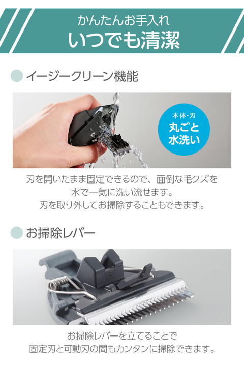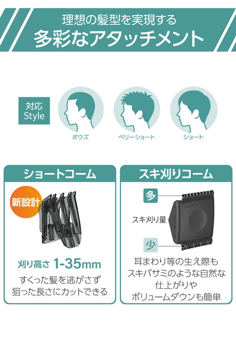 丸ごと水洗いOK&コードレスで持ち運びに便利なベーシックタイプ。、いつでもどこでもパパっとヘアカットできる。