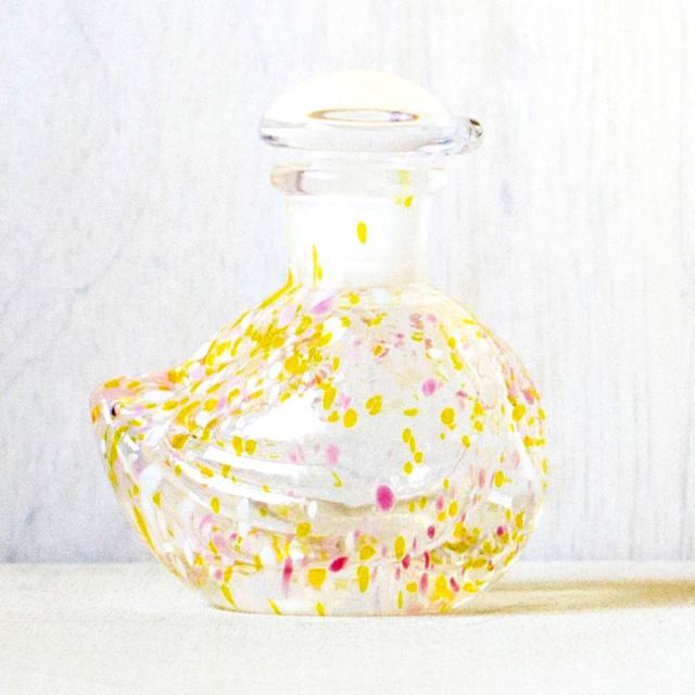 「スーッと細く出て、キレよく止まる。」使いやすさが自慢のガラスの醤油差しです。美しい透明のガラスに多彩色の斑点模様をあしらった小鳥の姿がなんとも涼し気で上品。置くだけで、食卓がパッと華やぐ粋な空間に。いつもの食事に加えて、コーヒーのミルクやシロップを入れたりと、おやつの時間にも登場させたいかわいさです。