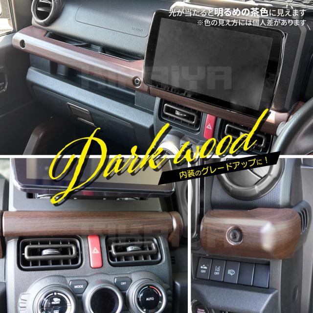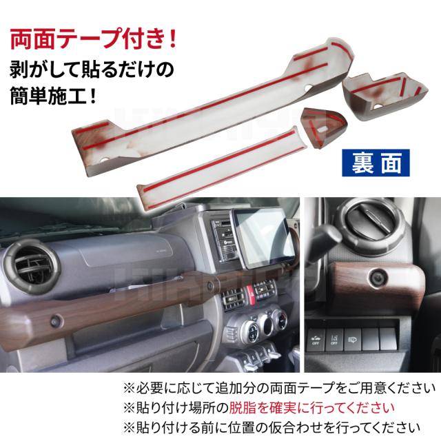 内装のドレスアップに最適なアイテム! シックな木目調で車内のイメージチェンジに! ●ジムニー(JB64)、ジムニーシエラ(JB74)兼用 右ハンドル仕様の貼付けパーツです ●裏面には両面テープがついており、剥がして貼るだけの簡単施工 ※貼り付け場所の脱脂を確実に行ってください ※必要に応じて追加分の両面テープをご用意ください ※貼り付ける前に位置の仮合わせを行ってください ※記載されている【適合車種】をご確認の上ご注文ください ※製品はお客様の自己責任にて、確実なお取り付けをお願いいたします ※ご使用上の事故、損害、破損について、当社は一切の責任を負いませんのでご了承ください ※お使いのモニター設定、お部屋の照明等により、実際の製品と色味や素材感が異なる場合がございます 品番:JMY-ZBSR-WO |