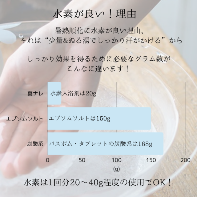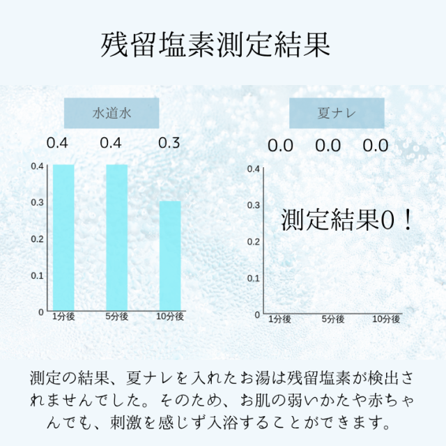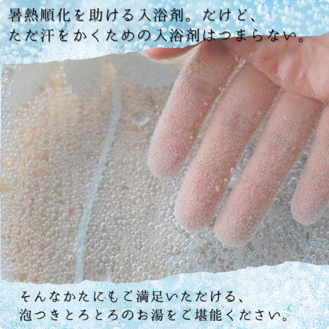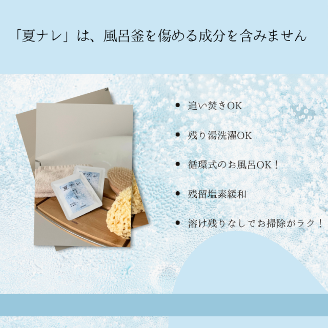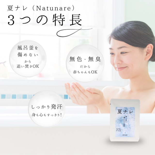 「夏ナレーNatunareー」は、暑熱順化をサポートする入浴剤です。 体に負担をかけずにしっかり内部から温めることができるため、小さな子どもからお年寄りなど、家族みんなでお使い頂けます。 「夏ナレーNatunareー」の特長 1.風呂釜を傷めないから追い焚きもOK!もちろん残り湯選択使用も可能です。 2.無色・無臭だから赤ちゃんもOK!お肌の弱いかたにもお使い頂けます。 3.しっかり発汗して身も心もすっきり! ※ご利用のモニター環境により色味に差異が生じる場合がございます。 |