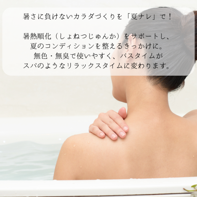 「夏ナレーNatunareー」は、暑熱順化をサポートする入浴剤です。 体に負担をかけずにしっかり内部から温めることができるため、小さな子どもからお年寄りなど、家族みんなでお使い頂けます。 「夏ナレーNatunareー」の特長 1.風呂釜を傷めないから追い焚きもOK!もちろん残り湯選択使用も可能です。 2.無色・無臭だから赤ちゃんもOK!お肌の弱いかたにもお使い頂けます。 3.しっかり発汗して身も心もすっきり! ※ご利用のモニター環境により色味に差異が生じる場合がございます。 |