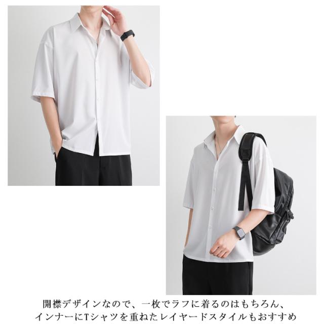 | 黒・白・グレーの3色展開 ゆるめのシルエットに、五分袖デザインで、リラックス感とトレンド感を兼ね備えた一着。 夏の暑さにぴったりな「アイスシルク素材」を使用した、ひんやり心地よい半袖シャツが登場! 通学・通勤・ちょっとした外出にも合わせやすく、着回し力抜群。 肌に優しい柔らかな素材感で、汗ばむ季節も快適な着心地をキープ◎ 開襟デザインなので、一枚でラフに着るのはもちろん、インナーにTシャツを重ねたレイヤードスタイルもおすすめ 清潔感のある見た目は、大人っぽさと抜け感を両立させた優秀アイテム | |