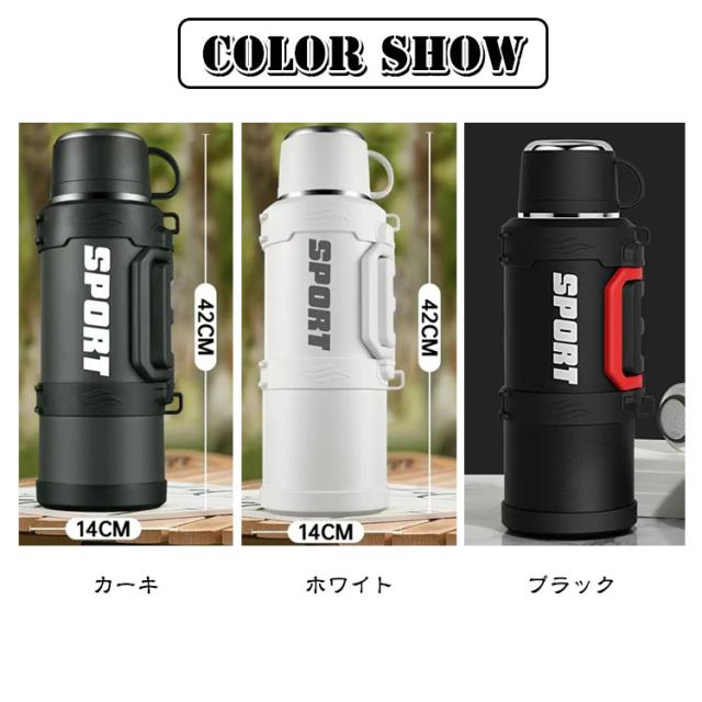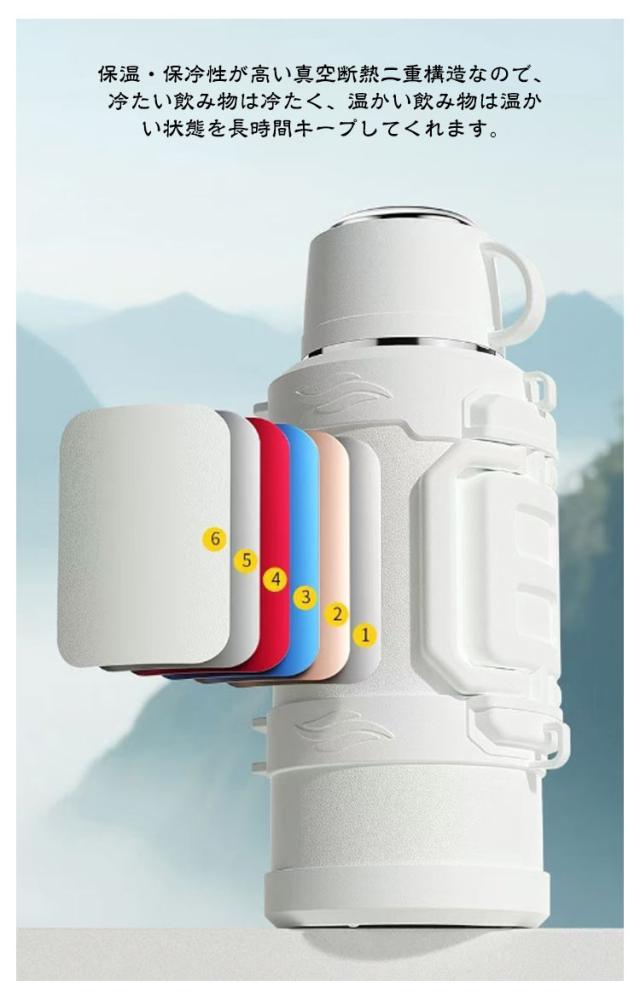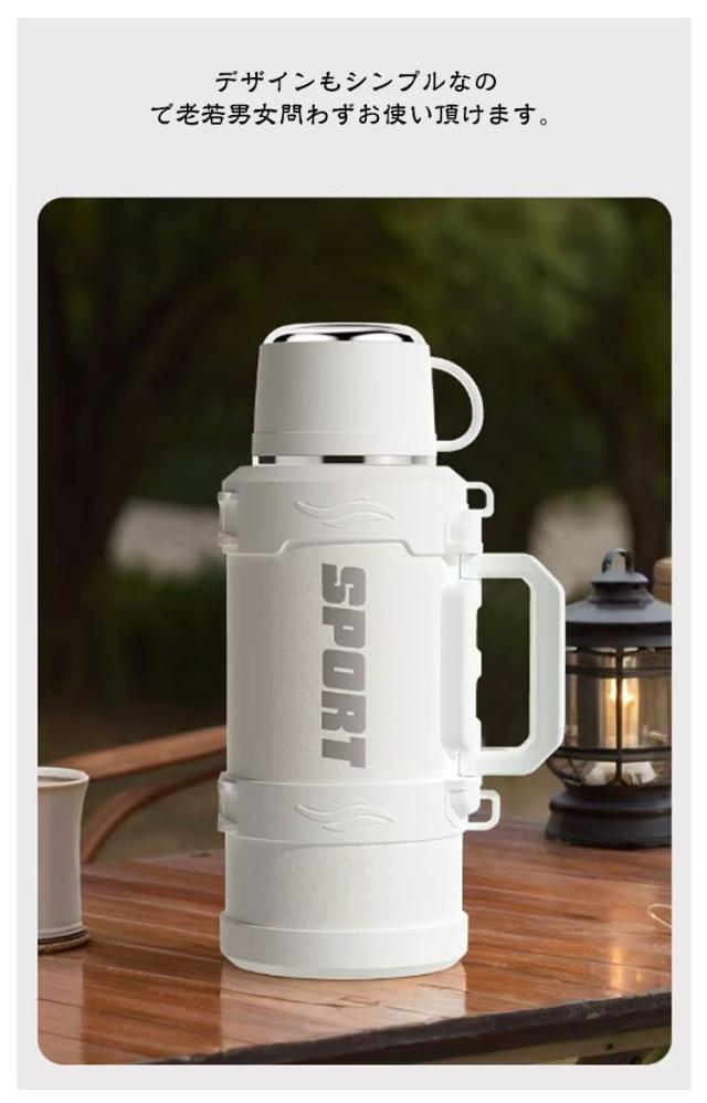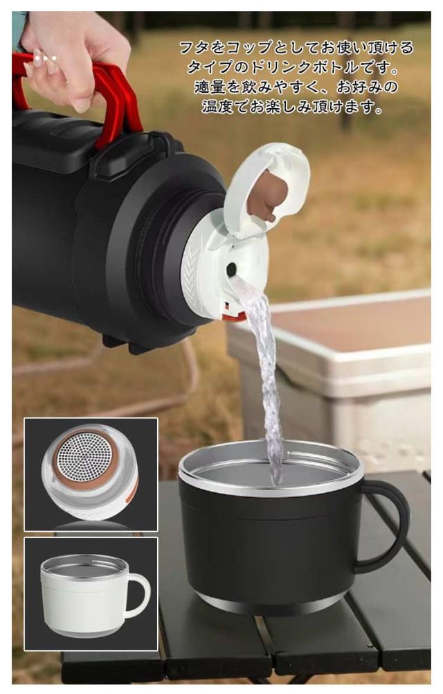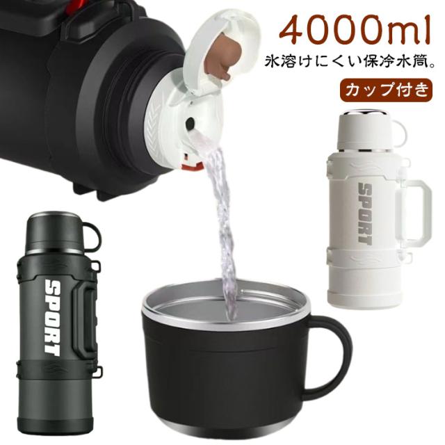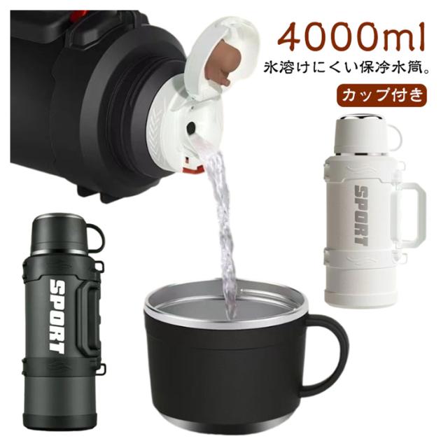 | 氷溶けにくい保冷水筒。【4000ml】【カップ付き】 保温・保冷性が高い真空断熱二重構造なので、冷たい飲み物は冷たく、温かい飲み物は温かい状態を長時間キープしてくれます。 フタをコップとしてお使い頂けるタイプのドリンクボトルです。適量を飲みやすく、お好みの温度でお楽しみ頂けます。 氷が入れやすい広口口径でパーツが少ないので手入れが簡単なのもポイント。 付属のストラップは長さ調節が可能。 デザインもシンプルなので老若男女問わずお使い頂けます。 | |