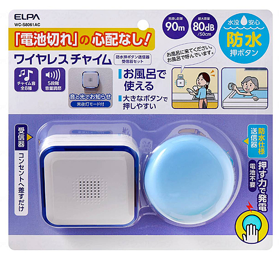 ワイヤレスチャイム 電池を使わないWCセット 防水押しボタン送信器+受信器セット WC-S8061AC 朝日電器 介護 介護用品