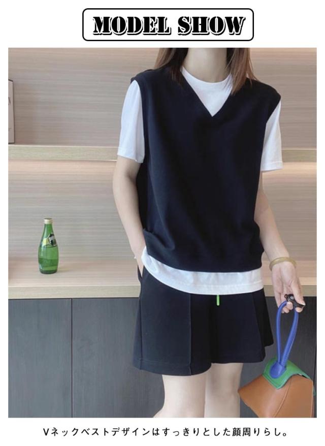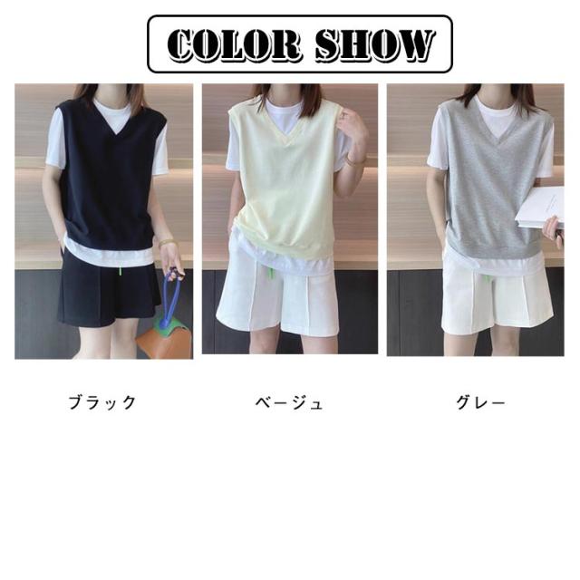 トップス 半袖 5分袖 20代 カットソー フェイクレイヤード レディース ベストフェイクレイヤードプルオーバー 大きいサイズ Tシャツ Vネック 重ね着風 夏新作 夏服 春服 XL ベストフェイクレイヤードプルオーバー 40代 50代 M L 30代 2XL 3XL